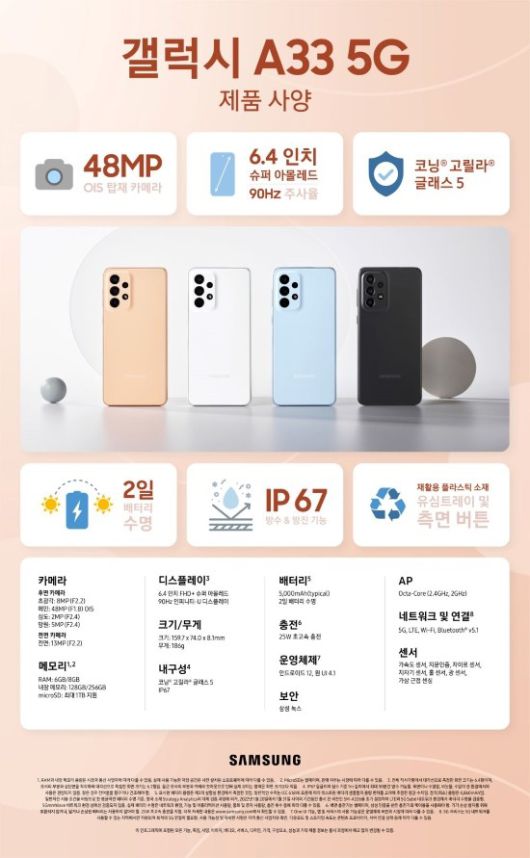 무게는 갤럭시A53 189그램(g) 갤럭시A33 186g이다. 각각 5000mAh 배터리를 장착했다. 완전 충전 후 최대 2일을 사용할 수 있다. 고속충전(25W)을 지원한다. 방수방진 등급은 1P67이다. '코닝 고릴라글래스5'로 전후면을 마감했다.