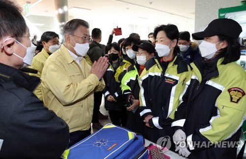 지난 6일 강원ㆍ경북 산불현장 방문에 나선 문재인 대통령이 경북 울진군 울진국민체육센터에 마련된 대피소를 방문, 울진여성의용소방대원들을 격려하고 있다. [연합뉴스 자료사진] |