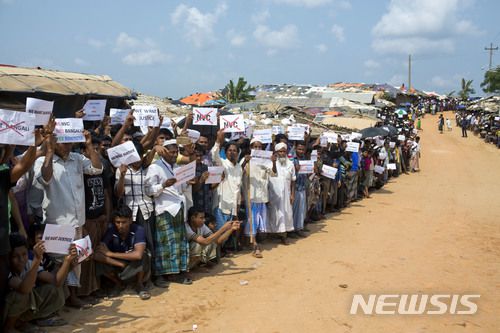 【쿠투파롱=AP/뉴시스】 방글라데시로 도망온 미얀마의 로힝야 난민들이 29일 난민촌에서 유엔 안보리 조사단의 도착을 손팻말을 들고 끈질기게 기다리고 있다. 국경을 넘어온 70만의 로힝야들은 방글라데시 정착 대신 탄압과 차별의 미얀마로 다시 돌아가는 상황에서 자신들의 '신분' 문제가 먼저 해결되기를 바라고 있다. 이들이 손에 들고 있는 종이에는 '국적확인카드(NVC)' 반대 의사가 적혀 있다. 2018. 4. 29. |