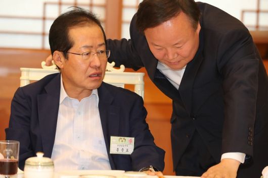 2016년 8월1일 당시 홍준표 경남지사(왼쪽)와 김재원 청와대 정무수석비서관의 모습. 연합뉴스 |