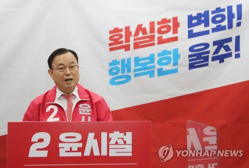 (울산=연합뉴스) 이상현 기자 = 윤시철 전 울산시의회 의장은 21일 울산시의회 프레스센터에서 기자회견을 열고 "무한한 발전 가능성을 가진 울주군을 확실히 변화시켜 행복한 울주를 만들려고 국민의힘 후보로 울주군수 선거에 출마하고자 한다"고 밝혔다.