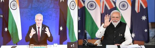 21일 화상 정상회담하는 나렌드라 모디 인도 총리(오른쪽)와 스콧 모리슨 호주 총리 |
