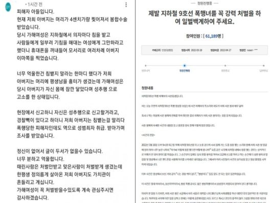 자신을 B씨의 아들이라 밝힌 C씨는 "아버지 머리가 4cm가량 찢어져 봉합 수술 받았다" 전했다. 그는 "당시 가해 여성(A씨)은 지하철에서 의자마다 침을 뱉고 사람들에게 일부러 기침을 했다"며 "(이를 본) 아버지(B씨)가 그만 하라고 말렸고 이후 휴대전화로 폭행당했다"고 당시 상황을 설명했다.