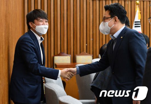 (서울=뉴스1) 허경 기자 = 이준석 국민의힘 대표(왼쪽)와 김성원 국민의힘 경기도당위원장이 22일 서울 여의도 국회에서 열린 시도당위원장 연석회의에서 인사하고 있다. 2022.3.22/뉴스1neohk@news1.kr[© 뉴스1코리아(news1.kr), 무단 전재 및 재배포 금지]
