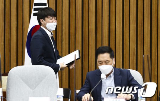 (서울=뉴스1) 이동해 기자 = 이준석 국민의힘 대표가 22일 서울 여의도 국회에서 열린 시도당위원장 연석회의에 입장하고 있다. 2022.3.22/뉴스1