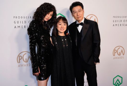 지난 19일 미국 로스앤젤레스에서 열린 제33회 미국제작자조합 시상식에 참석한 ‘오징어 게임’ 배우 정호연(왼쪽), 제작사 대표 김지연(가운데), 황동혁 감독. 로스앤젤레스=AP연합 |