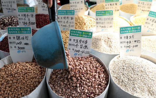 (서울=뉴스1) 박지혜 기자 = 수입 곡물의 가격이 최근 2년 새 47% 이상 상승한 것으로 나타난 가운데 16일 오후 서울 동대문구의 한 재래시장에 수입산 곡물이 진열되어 있다./뉴스1 |