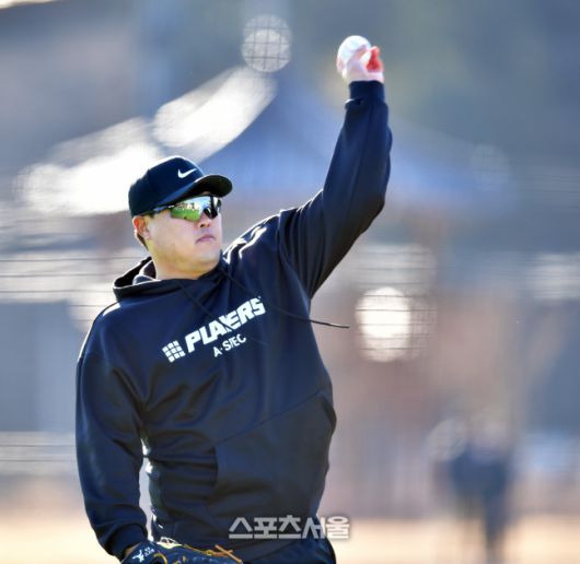 류현진이 한화이글스의 전지훈련 캠프가 진행중인 하청스포츠타운에서 3일 합류한 가운데 투수조에 합류해 롱토스로 몸을 풀고 있다. 2022.02.03.거제 | 강영조기자kanjo@sportsseoul.com |