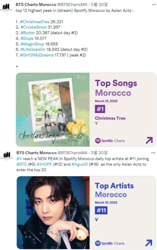 뷔의 ‘Christmas Tree’는 19일자 모로코 스포티파이 톱송 차트에서 26,221 스트리밍으로 1위에 올랐다. 이는 아시아 아티스트 최고 기록이자 방탄소년단으로서도 최고의 성적이다.