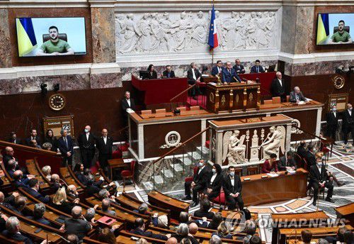 (파리 AFP=연합뉴스) 볼로디미르 젤렌스키 우크라이나 대통령이 23일(현지시간) 프랑스 파리 의회에서 화상으로 연설하고 있다. 2022.3.23. photo@yna.co.kr |