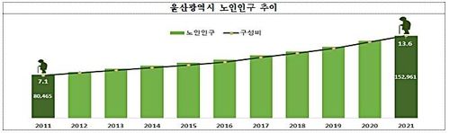 시에 따르면 2021년 울산 노인인구는 15만2천916명으로 전체 인구의 13.6%를 차지했다.