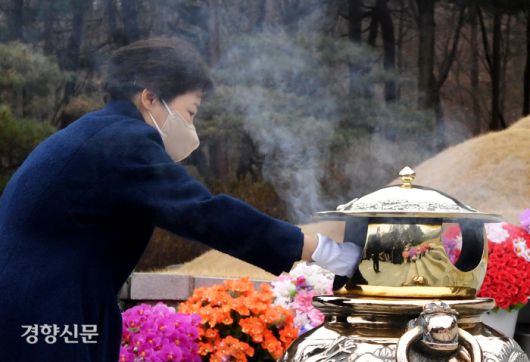 전직 대통령 박근혜씨가 24일 오전 서울 동작구 국립서울현충원을 찾아 고 박정희 전 대통령 내외 묘역에 참배하고 있다. 사진공동취재단 |