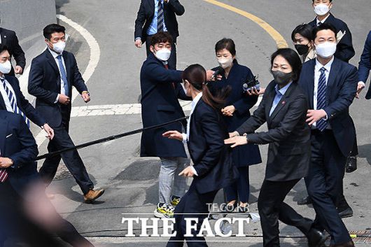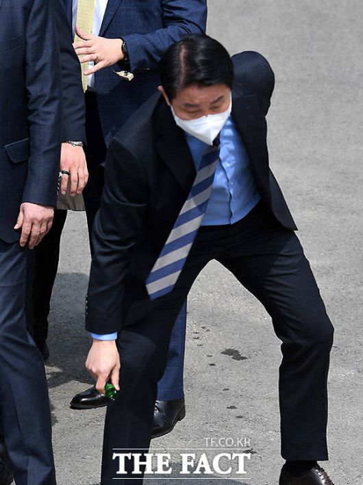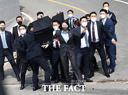 [더팩트ㅣ대구=이효균·윤웅 기자] 박근혜 전 대통령이 24일 오후 대구광역시 달성군 쌍계리 사저 앞에서 소감을 밝히던 중 소주병이 날아들어 행사가 일시 중단되고 있다.