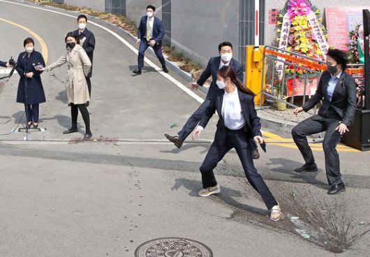 박근혜 전 대통령이 24일 낮 대구 달성군 유가읍에 마련된 사저에 도착해 시민들에게 인사말을 하던 도중 '인혁당(인민혁명당) 사건' 피해자라고 주장하는 사람이 던진 소주병이 깨지자 경호원들이 몰려들고 있다. 송봉근 기자 |