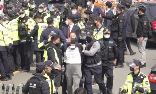 박근혜 전 대통령을 향해 소주병을 던진 A씨가 경찰에 연행되고 있다. 독자 제공 |