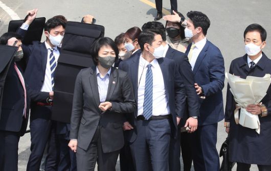 (대구=뉴스1) 공정식 기자 = 박근혜 전 대통령이 24일 오후 대구 달성군 유가읍 쌍계리 사저 앞에 도착해 차량에서 내려 대국민 메시지를 발표하는 도중 한 남성이 소주병 던지며 소동을 일으키자 경호원들의 경호를 받고 있다. 2022.3.24/뉴스1 |