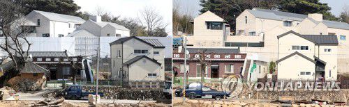 작업자들과 공사 차량이 드나드는 도로 쪽 공사 가림막이 사라지면서 일부 사저 건물은 벽면 콘크리트에 자연석을 자연스럽게 박아 넣는 방식으로 장식한 무늬가 새롭게 드러났다.