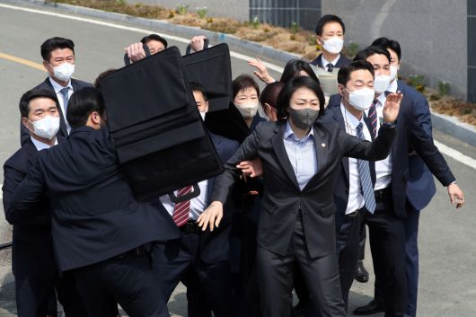 24일 오후 박근혜 전 대통령이 대구 달성군 사저에 도착해 대국민 담화문을 밝히던 중 갑자기 소주병이 날아들자 경호원들이 박 전 대통령을 에워싸고 있다. (연합뉴스) |