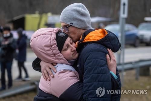 우크라이나 국경에서 포옹하는 피란민 부부 |