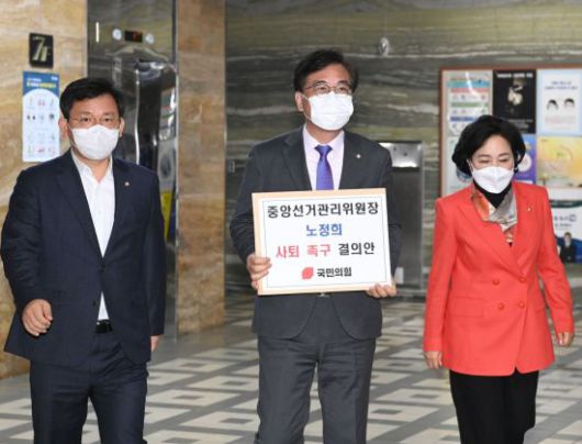 [아시아경제 박준이 기자] 국민의힘은 대통령선거 사전투표 부실관리 논란에 휩싸인 중앙선거관리위원회의 노정희 위원장에 대한 사퇴 촉구 결의안을 국회에 제출했다.