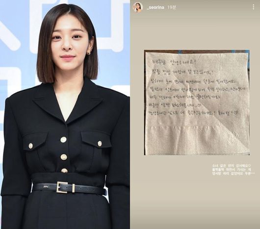 배우 설인아(왼쪽)가 25일 한 팬이 전한 냅킨 편지(오른쪽)를 공개했다./사진=SBS, 설인아 인스타그램 |