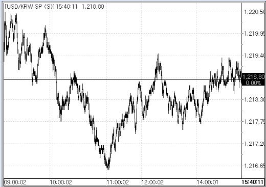 25일 서울외국환중개에 따르면 이날 원·달러 환율은 전 거래일 종가(1218.80원)과 같은 수준으로 장을 마감했다. 이날 환율은 전일 종가 대비 2.10원 오른 1221원에 시작한 뒤 상승폭을 1원 안팎으로 낮추면서 움직임을 좁히다가 네고(달러 매도) 물량에 저점을 1216.50원까지 낮춰 하락 전환하기도 했으나 저가 매수에 낙폭을 좁히면서 보합권 내에서 등락하는 흐름을 보였다.