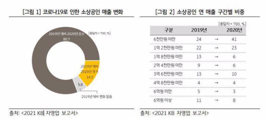 [IT동아 정연호 기자] KB금융지주 경영연구소가 수도권 소상공인을 조사한 바에 따르면, 조사에 응한 소상공인의 2020년 매출은 전년 대비 평균 24% 감소했다. 소상공인 80.7%는 코로나19 이후 매출 감소를 경험했고, 연 매출 6천만 원 미만 소상공인은 2019년 24%에서 2020년 41%로 증가했다. 대다수의 소상공인이 코로나19 이후로 경영 위기에 처하게 된 것이다.