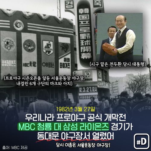 (서울=연합뉴스) 우리나라 프로야구 공식 개막전은 1982년 3월 27일 동대문야구장에서 열린 MBC 청룡 대 삼성 라이온즈 경기였습니다. 시구는 전두환 당시 대통령이 맡았습니다.