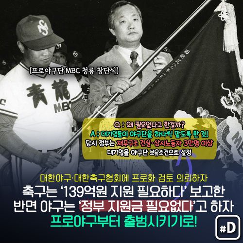 정부는 이어 대한야구협회와 대한축구협회에 프로화 검토를 의뢰했는데요. 당시 축구협회는 139억원의 막대한 정부 지원이 필요하다고 정부에 보고한 반면 야구협회는 정부 지원금 없이 프로화가 가능하다고 보고해 정부는 프로야구부터 출범시키기로 했습니다.
