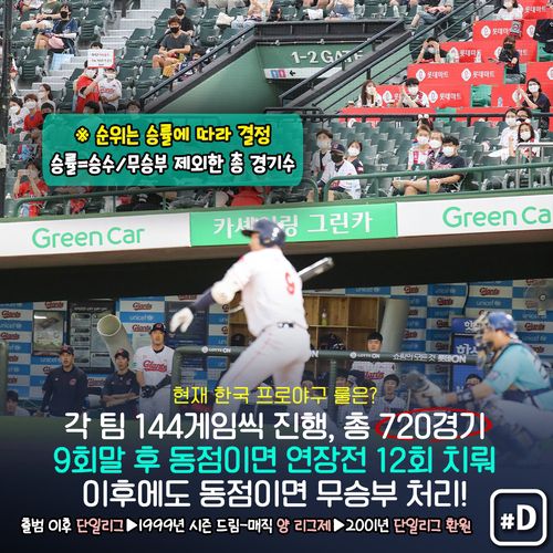 현재 프로야구는 각 팀이 144게임씩 진행해 총 720경기를 벌이며 9회말 이후 동점일 경우 연장전을 펼치게 됩니다. 연장전은 12회까지 치르는데 12회말 이후 동점이면 무승부로 처리합니다.