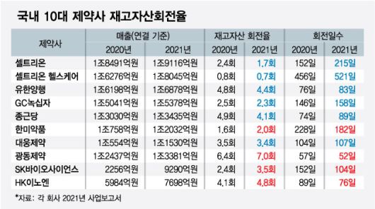 28일 금융감독원에서 제공하는 국내 제약·바이오 기업 10곳의 사업보고서를 분석한 결과 6곳은 재고자산 회전율이 전년보다 낮아졌다. 한미약품·광동제약·SK바이오사이언스·HK이노엔 등 4곳은 회전율이 개선돼 재고를 처리하는 기간도 짧아졌다.
