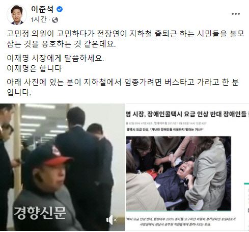 이 대표는 28일 사회관계망서비스(SNS)에 “고민정 의원이 고민하다가 전장연이 지하철 출퇴근 하는 시민들을 볼모삼는 것을 옹호하는 것 같다”며 “이재명 시장에게 말씀하시라”고 적었다. 그러면서 그는 “이재명은 합니다”라고 덧붙였다. 이 대표는 이 전 지사가, 2016년 11월 성남시장 시절, 장애인콜택시 요금인상에 반대하는 장애인 단체 대표를 내보내라고 지시하는 동영상과 관련 기사를 첨부하면서 이같이 밝혔다.