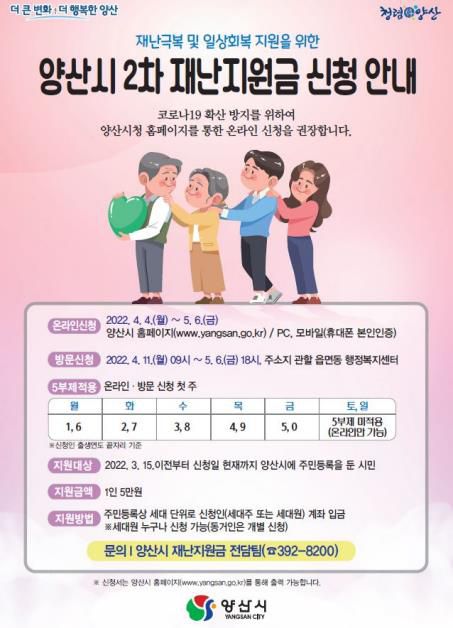 지난 15일부터 재난지원금 신청일까지 양산시에 주소를 둔 시민 35만3천여명에게 시비 182억원을 들여 5만원 씩 현금을 지원한다.