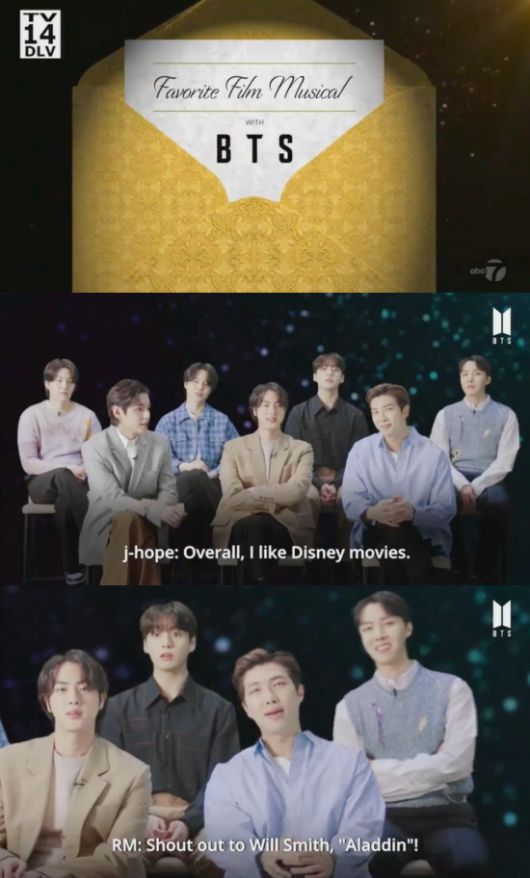 진 역시 "디즈니 영화가 감성을 자극한다"고 거들었다. RM은 "알라딘의 윌 스미스에게 '샷 아웃'(Shout out)을 보낸다"며 존경의 뜻을 담아 인사했다.