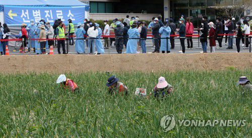 지난해 5월 강원 강릉시 보건소 인근에서 밭일하는 주민들 너머로 코로나19 검사를 받기 위해 기다리는 외국인 근로자들 모습. [연합뉴스 자료사진] |