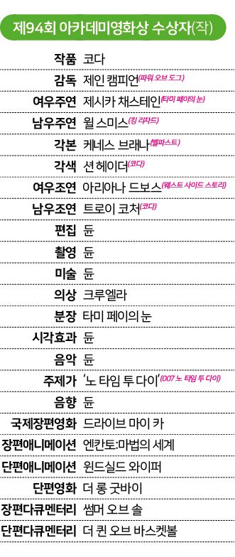 역사가 새로 쓰였다. 온라인동영상서비스(OTT) 영화 ‘코다’가 오스카 역사 최초로 작품상을 가져갔다. 27일 오후(현지시간) 미국 로스앤젤레스에서 열린 제94회 아카데미영화상 시상식은 실리콘밸리 기업 애플을 위한 무대였다. 할리우드가 OTT 전성시대를 인증하는 자리이기도 했다.