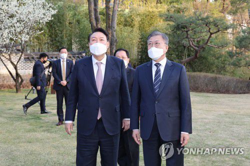 대화하는 문재인 대통령과 윤석열 대통령 당선인 |