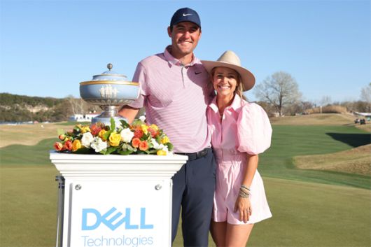 스코티 셰플러가 월드골프챔피언십(WGC) 델 테크놀로지스 매치플레이에서 우승한 뒤 아내 메러디스 셰플러와 기뻐하고 있다. [AFP = 연합뉴스] |