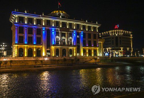 우크라이나 깃발 형상화한 북마케도니아 외무부 청사 |