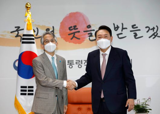 윤 당선인은 전날 아이보시 대사를 접견하며 “양국의 정치지도자, 관료, 국민이 강력한 힘으로 양국 관계를 미래 지향적으로 밀어붙여야 한다”며 “한·일 양국 관계를 미래 지향적으로 강하게 밀어붙이면 다른 문제들이 어려울 거 같지만 대화를 통해서 잘 해결될 수 있을 거라고 확신한다”고 했다.