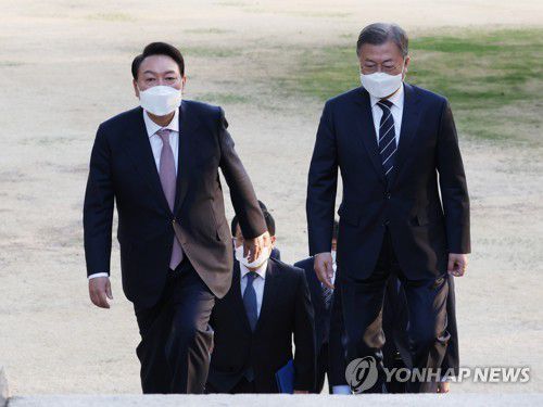 만찬 회동 나선 문재인 대통령과 윤석열 대통령 당선인 |
