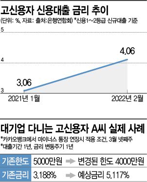 인터넷은행들만 살펴보면 1~2등급 적용금리를 1월엔 케이뱅크 4.50%, 토스뱅크 4.19%까지 올렸다가 2월엔 각각 3.93%, 3.94%로 소폭 조정한 상황이다. 카카오뱅크는 작년 11월부터 고신용자들에겐 신규대출을 중단해 따로 공시하지 않았다. 다만 기존에 신용대출을 받았던 1~2등급 대출자들이 연장을 신청할 때 금리를 올리는 것으로 보인다.