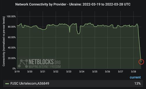 앞서 이날 오전 글로벌 인터넷 감시단체 넷블록스는 트위터에 우크라이나 인터넷 연결이 전쟁 이전의 13% 수준까지 떨어진 것으로 파악된다며 통신 장애가 전국적 규모로 심해지고 있다고 밝혔다.
