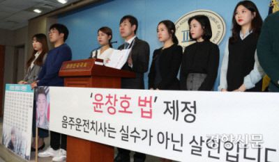 2018년 10월 21일 국회 정론관에서 바른미래당 하태경 의원과 윤창호군 친구 7인이 국회의원 100인이 참여한 음주운전 처벌 강화를 촉구하는 ‘윤창호법’ 공식발의 기자회견을 하고 있다./권호욱 선임기자 |