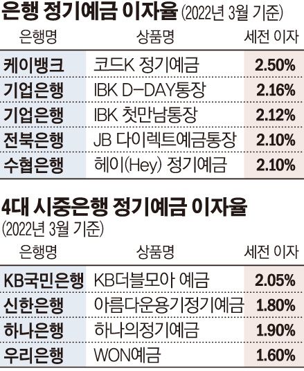 이날 기준으로 가장 높은 금리의 예금상품은 케이뱅크의 '코드K정기예금'이다. 코드K정기예금은 연 2.50% 금리를 제공한다. 1억 원을 예치했다면 1년 후 이자가 250만 원(세전) 붙는다. 코드K정기예금은 1년 전(2021년 3월 말 기준)에도 은행권에서 금리가 가장 높은 예금 상품이었다. 당시 이 상품의 금리는 연 1.3%로, 1억 원을 맡겼다면 1년 후 받을 수 있는 이자는 130만 원이다. 같은 금액(1억 원)을 넣었을 때 이자로 120만 원을 더 받을 수 있게 된 셈이다.