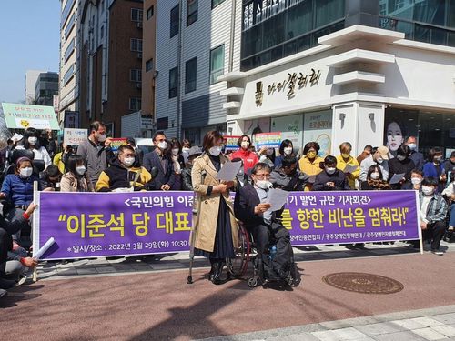 광주장애인차별철폐연대 등 3개 장애인단체는 29일 광주 서구 국민의힘 광주시당 앞에서 기자회견을 열고 "이 대표는 출근하는 시민과 장애인단체 활동가를 구분하며 비난하고 있다"며 "갈등을 완화하고 중재하는 역할을 해야 할 정치인이 갈등을 증폭시키고 있다"고 지적했다.