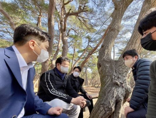송영길 더불어민주당 전 대표가 27일 경남 양산시 통도사에서 전용기 의원(왼쪽) 등 당 청년 정치인들과 이야기를 나누고 있다. 전용기 의원실 제공 |