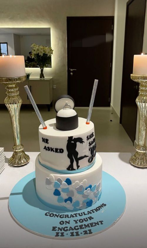 기념 2층 케이크에는 '그가 물었다', '그녀는 말했다 예스'란 글이 장식돼 있다. '11-11-21 약혼을 축하합니다'라는 약혼 날짜도 적혀 있었다.