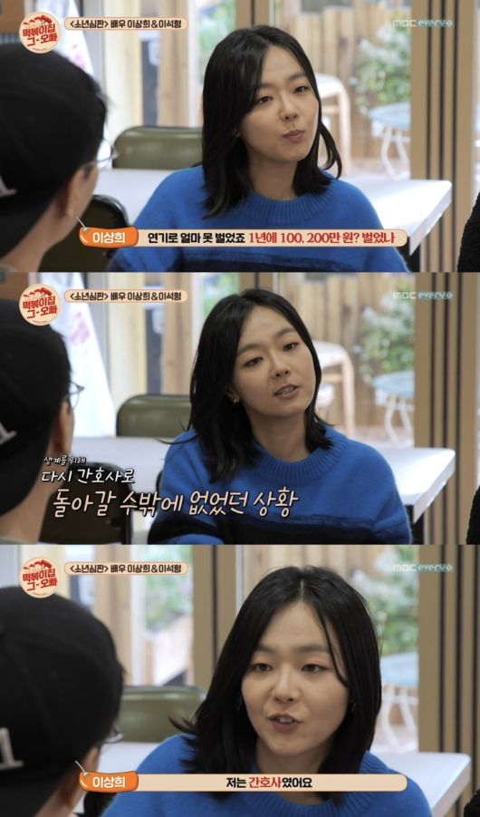 이날 이상희는 "저는 간호사였다. 예전에 대학병원에서도 잠깐 일했다. 조금 버거워서 관두고 연기했다. 연기에 관심은 있었는데 연기하기 위해 관둔 건 아니었다. 친한 친구가 상명대 영화학과였다. 그때 영화 만드는 걸 보고 막연하게 관심이 생겼다"고 털어놓았다.