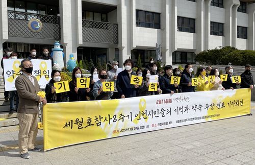 (인천=연합뉴스) 김상연 기자 = 인천지역 시민단체가 30일 세월호 참사 8주기를 앞두고 '기억과 약속' 주간을 선포하며 진상규명 등을 촉구했다.